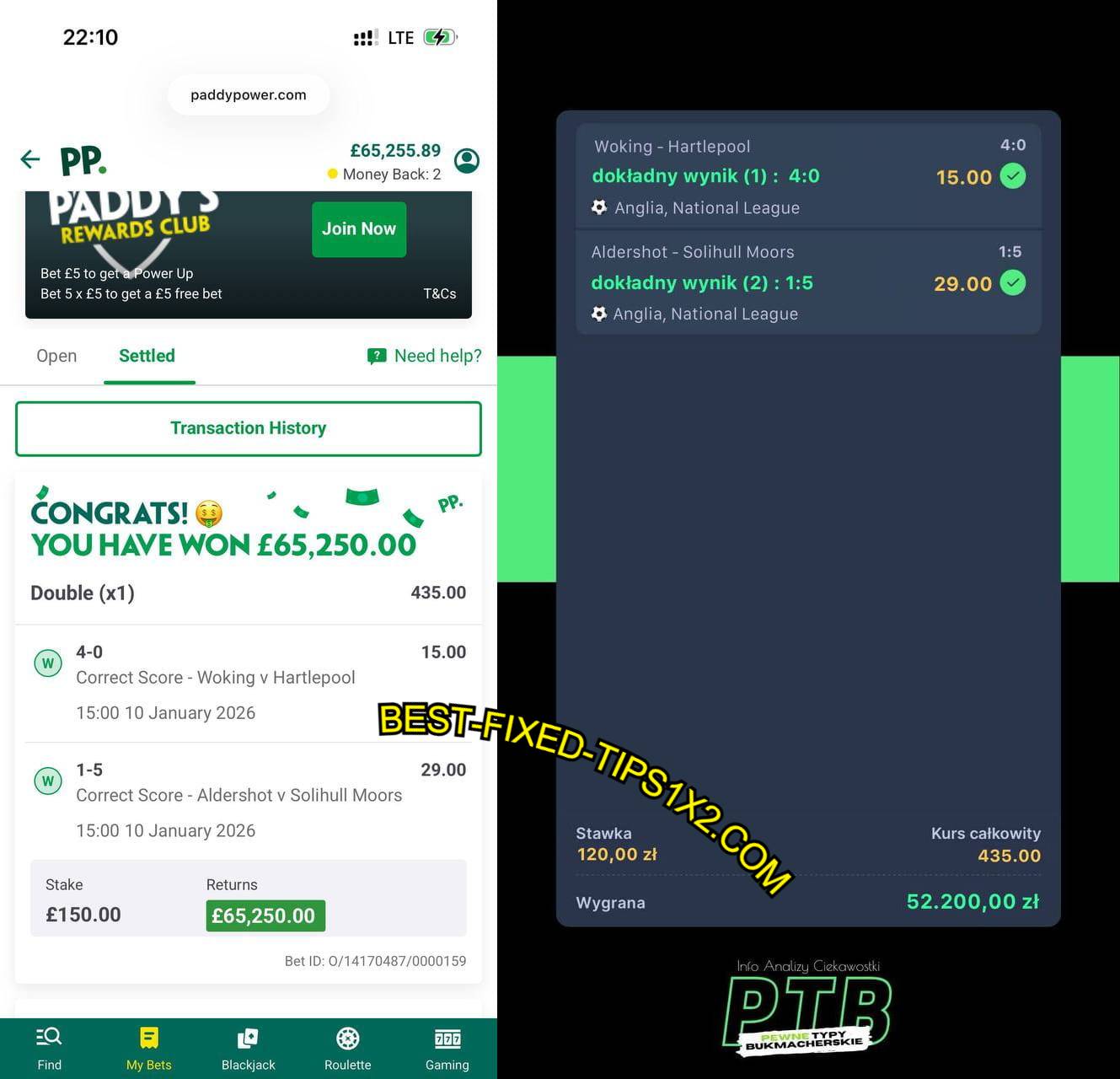 | Aldershot vs Solihull Moors | 1:5 (CS) | 29.00 | FULLTIME: 1:5 WIN |